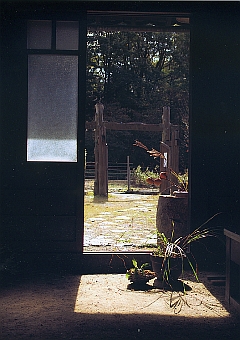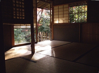 ◆茶室の中なのだろう。庭から光が入って、畳を照らす。何というのかな、名前は分からないが、手前にある仕切り、絵としてはこれが邪魔だった。お茶の世界では何か意味があるのかも知れないが。これを外して絵を作った方がすっきりしただろう。 カメラが勝手にフラッシュをたくのに気がつかない時代に、「たかなかった」と意識することは、大切なことだ。