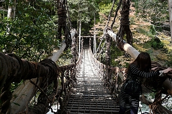 ◆写真を大きくしてみると確かに手すりにしがみついている女性がいる。しかし、一見したところでは、つり橋の向こう半分の陽が当たっているところに目がいって、その女性に気づくのはいちばん最後になる。つり橋を狙っていたら、たまたまそこに怖がっている人がいたという構図だろう。初めからこの人を狙うなら、別の構図になるはず。