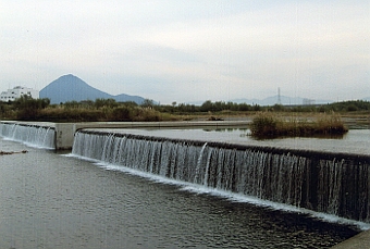 ◆野洲川の落差工。流れ落ちる水が見事である。日によっては釣り人がたくさんいるのだが、この時は無人。向こうに三上山が見えて、この落差と組み合わせて絵を作りたいところ。特に冬場、ここから見ると三上山あたりから太陽が上がる。しかし対岸の無粋な建物が邪魔をする。この写真にもその建物が写っているのだが、空の白さにまぎれて目立たない。これはこれで成功だった。邪魔なものを目立たなくする、これも写真の術。