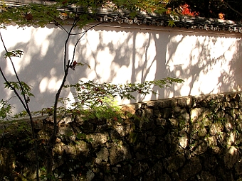 ★西教寺。白い土塀に木立の影が手前の紅葉との趣を撮りました。