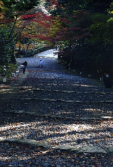 ◆参道の手前に落ちる木漏れ日をうまく使った。一目見たときに、まず第一にこの光に目がいく。そして暗い参道をくぐって明るい橋の上へ。その手前で落ち葉をはく人。その人のエプロン姿が、石畳に沈んだのがおしかった。上端、中央に遠くの屋根らしいものが白く飛んでいるのが気になる。カットで逃げる手もあるが、出来れば撮影時に処理しておきたかった。