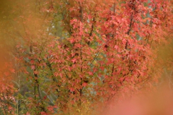◆紅葉としては大して美しくもない葉っぱを捉えて、前にボケを置くことでうまきうまとめた。向こうにも木があるらしく、枝のないところがすっぽ抜けしないこともよかった。光線がもう少しはっきりしていたら、いい写真になっただろう。