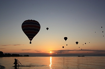 ★気球は比較的低いが、水中で脚立に乗り撮影していた報道関係カメラマンが去って行く影と波、船(救出船)、この写真も捨てがたい気持ちです。