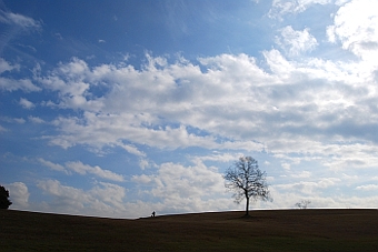 ◆もうすっかり葉を落としてしまった。自転車の男性は、ちょっと小さすぎた。人物を入れるには、お互いが確認を取り合える状態でないと無理だろう。偶然ではとても無理だ。声での連絡が出来るのかどうか。携帯電話で連絡取り合ってという世界だろう。