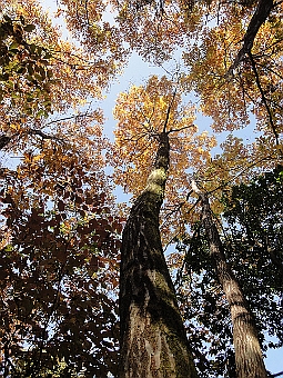 ★森の中で、陽を求めて他の木々と競争するように大きく大きく伸びあがっているコナラ。その先の方で冬の準備作業の紅葉が始まっていました。きっと、やって来るだろう春の温もりを信じて。