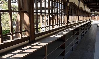 ◆宇治の興聖寺。格子の下は下駄箱だそうな。これがいっぱいになるときもあるのだろうが、いまは開店休業。猫の子一匹いない。格子に当たる陽がのどかだけによけいその感を強くする。廊下の突き当たりに、僧の姿でも小さく見えればいいのだけれど。