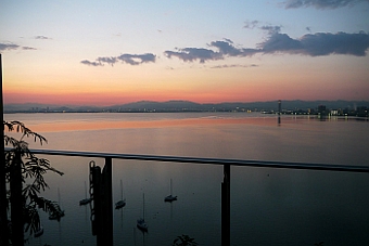 ◆一等展望台から見た琵琶湖の朝。横雲がたなびいて。これが日の出とともに輝き出すのだが、それはもうちょっと後。問題はいまの場合、この雲に惑わされた。結局、雲にも、下のヨットにも、手前のベランダの手すりにも、博愛衆に及ぼしで、平均をとったところで、水平線が画面を2分するところへ来てしまった。展望台からの写真は結構手強いぞ。