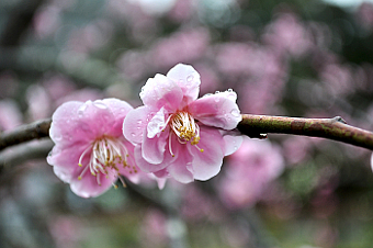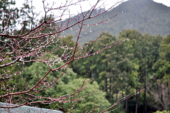 雨に濡れた梅の花を枝を入れてをアップで撮りました。