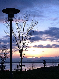 ◆太陽と木を合わす。よく使われる手だ。普通は太陽そのものを幹と会わすのだが、左の写真は太陽の実体は見られない。これはこれでOKだろう。ケヤキの幹の左側の人物は、左右どちらかへ離した方がよかっただろう。