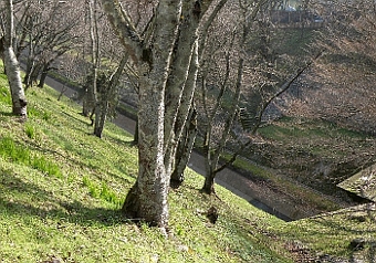 ◆水平線を無理に傾けたのかと驚いたが、疎水端だときいて事情が分かった。いい光だ。この光があれば、最低線の絵は作れる。中央の幹が3本ほど集まっているのが絵のバランスの上から気になるが、1本の木から分かれたものらしい。事情は事情で仕方ないにしても、その向こうの木とも重なり加減だし、別の木を狙った方がよかったかも知れない。花が咲いたときのテストとして、人が少ないうちに構図の下見をしておくとよい。 |