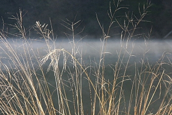 早朝の晴れた日公園の傍の池から霧が立ち上っておりました。その霧を背景にして朝日に映える池の周りの草木を接写しました。