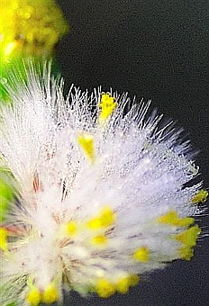 ◆タンポポの胞子のアップ。ピントは胞子の周辺部にぴしゃりと来ている。それはいいのだが、バックが暗かったためか、白い胞子の全体が飛びかげんなのがシンドイ。たとえばこの場合だと左下あたりは胞子の線はカメラに向かってくるはずで、それにきっちりピントが来ると、また別の見え方がする。そこらが飛んでしまったため描写があいまいになってしまった。