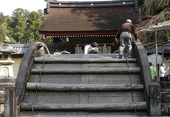 お多賀さんの玄関に位置するこのそり橋は、神橋で例祭にはお御輿が渡られると言う。年配の方も、手と足を使い登るようにして渡っておられたので、私も渡ろうとして、勢いを付けて上がるのですが、次の段に到達するまでに落ちます。無理でした。