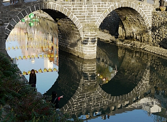 ◆眼鏡橋の上に何か飾りがあったらしい。それをカットして、水面に映る部分だけをという意味だろう。このように水面に波がなくて、ほとんど完全に姿が映る場合は、どうしても写真が上下対称になってしまい、好ましい構図にはならない。きっちり見ると、左の川岸にたたずむ女性がおり、めがねの陰の部分で指さす人(子供かな?)もいるのだが、それが生きてこない。そこらあたりを狙いとして絵をまとめたらよかっただろう。トリミング見本