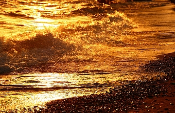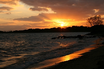 1は湖面が暗いが、こちらは明るい。撮影時間は1が7:10、2が7:20となっている。10分の違いで太陽が高くなっているのが分かる。1のように波の引き際が広く、そこを犬が走っていたら・・・。そんな都合よく犬がいますかいな。ゴモットモ。