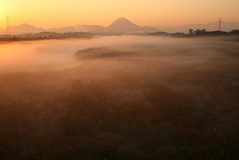 野洲川に朝靄が出ると三上山等の山々が浮いて見える。なんとなく墨絵を見るようで美しいその姿を写真にしたいと、今年も3・4回、今朝は出るだろうそんな思いで早くから出かけました。ところが靄が出たのは一回だけ、それもほんの少しでした。残念ですが今年はダメでした。でも朝日が昇る処を場所を変えて撮って見ました。