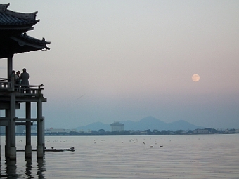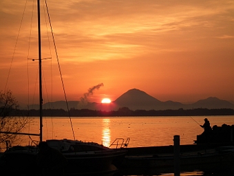 ◆場所は浮御堂の南の公園から続きの所にある港だろうか。以前は純然たる漁港だったが、今はヨット基地という方がふさわしい。もしそこだとすると太陽はこれ以上右へは寄らない。左稜線にはギリギリというところだろう。港からなぎさ苑を通り抜けたところの入江あたりではなかったか。