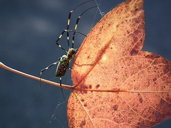 道路際で見つけた、カエデの葉が蜘蛛の糸に絡み、蜘蛛が獲物だと捕獲している様子です。実態は邪魔者を落とそうとしているかもしれません。