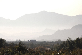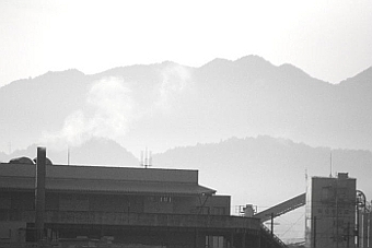 濃い霧が終りに近づくいた頃、カメラには実際の霧の状態よりも暗く、色も濃く記録されました。逆光であるのでマイナス補正したのがいけなかったと思います。霧は実際より濃く、暗く写るのは経験しておりましたが逆光の方が気になりました。従い作品は修正ソフトで明るくしております。工場は避けられないのですが、むしろ意識して入れました。