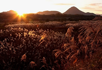 多少気になる点としては、屋根の先端が杉の姿に埋没してしまったこと。せめて左側の1本が対処できていたら。右後ろへ少し下がれば屋根に隠れたのではないか。そうすれば屋根の棟の線も少しは出ただろうし、右に見える背の高いススキが画面左側の空へ突き出て夕日にキラキラ輝いたのではないか。