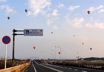 ◆撮影場所が(気球の)発着場所から離れていたのだろう。全部が小さく散らばってしまった。気球だけ撮ったのでは形がつかなかった。道路標識を入れたのは正解だった。撮影場所の特定にもつながるし、これで決まった。しかし、手前のマークは「駐車禁止」と違うの?。車も走ってへんしまあエエか。
