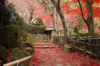◆1本の木についている葉っぱ何枚か。ヒマがあったら落ち葉の総数を勘定してみたい。ということで、この写真は落ち葉(地面)なのか、木の葉なのか。気持ちは向こうに見える門に縛られたらしい。それが中心に来た。結果、落ち葉の道と残った紅葉とが半々に。狙いが絞りきれなかった。目の前に現れた風景に思わずシャッターを切った結果だろう。気持ちは分かるけど。