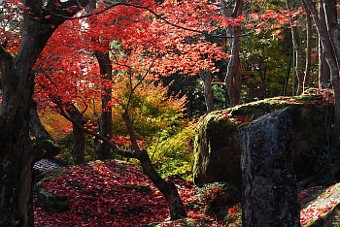 雲の間から時おり陽がさして、もみじ葉とこけが輝きます。
