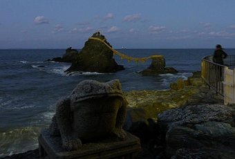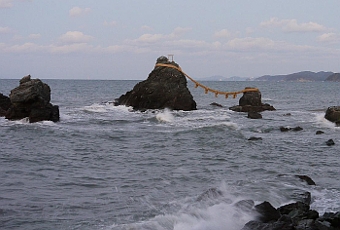 二見輿玉神社の鳥居の役目の二見浦、夫婦岩に10〜1月に夫婦円満のシンボルである夫婦岩の中央から月が昇るそうです。